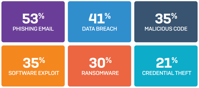 오늘날 사이버공격의 광범위한 다단계 전략과 규모는 매우 효과적이란 점도 입증됐다. 그 예로, 사이버공격 피해의 53%는 피싱 이메일에 당했고, 30%는 랜섬웨어 공격을 받았다. 41%는 데이터 유출로 어려움을 겪고 있다고 응답했다.