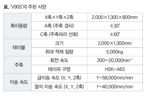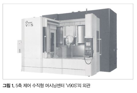 이들 요구에 대응하기 위해 동사에서는 금형가공기로서 실적이 있는 수직형 머시닝센터(MC) V 시리즈를 베이스로, 새롭게 개발한 A축(경사)/C축(회전)으로 주축을 선회하는 5축 제어 수직형 MC ‘V90S’를 개발했다. 그림 1에 외관, 표에 주된 사양을 나타냈다.