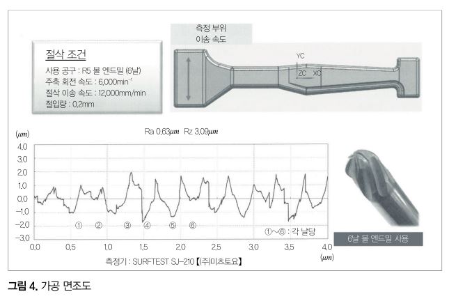 가공 면조도의 결과를 그림 4에 나타냈다. 이론 면조도 1μm의 다듬질 피크에 대해, 실제 면조도는 Rz3.09μm로 양호한 면품위를 얻을 수 있었다. 이 다듬질가공 시간은 9시간 57분인데, 실용적이라고 하는 이론 면조도 5μm의 다듬질 피크로 하면 2시간 27분으로 가공이 완료된다.