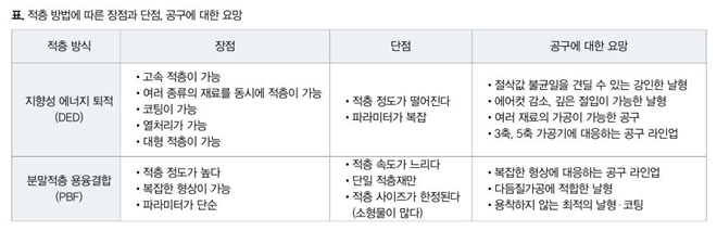 AM는 적층 소재로, 금속 타입과 수지 타입으로 분류할 수 있다. 금속 타입은 적층 방식에 따라 2종류로 분류되며, 지향성 에너지 퇴적(Directed Energy Deposition, 이하 DED)와 분말 적응 용융 결합(Powder Bed Fusion, 이하 PBF)로 나뉜다.