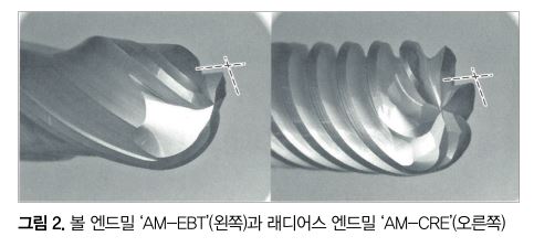 이에 동사에서는 AM에 의한 고경도 피삭재에 대해 효율적으로 단수명, 깊은 절입에 대응할 수 있는 공구 볼 엔드밀 ‘AM-EBT’(그림 2 왼쪽, R3~R10의 6아이템)과 래디어스 엔드밀 ‘AM-CRE’(동 그림 오른쪽, Ø6~Ø20의 6아이템)을 개발했다.