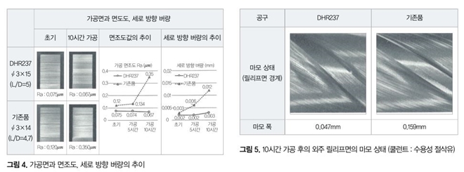 또한 버량은 10시간 가공 후의 비교에서는 DHR237가 0.003mm인 것에 대해, 기존품은 0.012mm가 되어 DHR237의 버량은 매우 작은 것을 알 수 있었다.