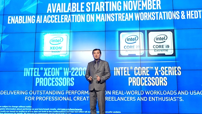 이어서 이주석 인텔 코리아 전무는 최신 인텔® 제온®과 인텔® 코어™ X-시리즈 프로세서를 선보였다. 이번에 공개된 인텔® 제온® W-2200 프로세서는 전문 크리에이터를 위해 제작된 프로세서로 4K 비디오 편집, 3D 렌더링 및 게임 개발 등에 최적화된 플랫폼이다. 인텔® 코어™ X-시리즈는 프리랜서 및 마니아용 18코어 제품군이다.