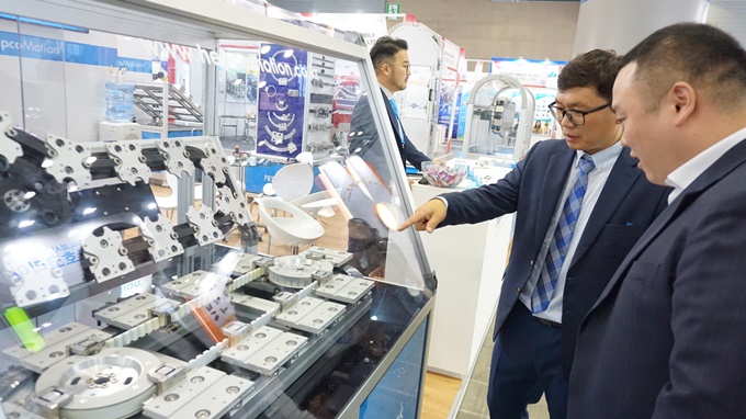 ▲ 2019 한국기계전에 참가한 햅코모션. 황승용 지사장이 전시제품에 대해 참관객에게 설명하고 있다.