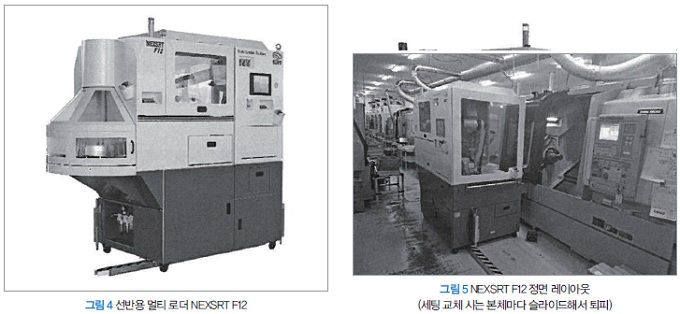 그림 4는 선반용 NEXSRT F12이다. 배출 시는 워크를 회전 방향으로 컨테이너 정렬시키는 등 다관절 로봇이 아니고는 할 수 없는 움직임이 가능하다. 세팅 시에는 그림 5와 같이 본체마다 슬라이드해 퇴피하고, 복귀 시에는 로봇 핸드의 레이저 센서로 공작기계와의 거리를 측정해 보정을 하기 때문에 위치를 재현할 수 있다.