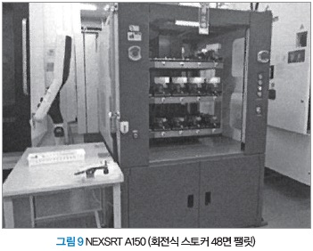 그림 6은 머시닝센터용 NEXSRT A150/A300이다. 다관절 로봇에 의한 지그 세정을 할 수 있기 때문에 절삭분과 절삭유 제거의 신뢰성이 높고, 3축 머시닝센터에서도 사용할 수 있다(그림 7). 또한 2대의 머시닝센터와 접속할 수 있는 점도 특징이다(그림 8). 회전식 스토커(그림 9)는 깔끔하게 수납되는 레이아웃으로, 다양한 공작기계 메이커의 머시닝센터와 접속 가능하다.