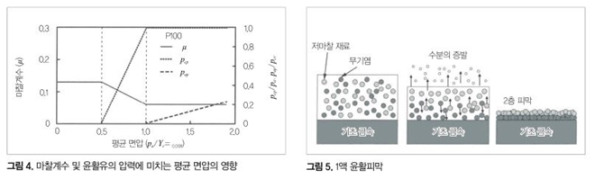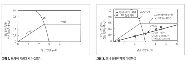 또한 윤활유를 이용한 경우의 마찰법칙에 대해서는 일반적으로 이용되는 윤활유의 점도와 프레스 가공 속도에서는 윤활유의 점성저항을 무시할 수 있는 레벨에 있으며, 그림 4에 나타낸 것과 같다. 평균 면압이 높은 영역에서는 윤활유의 압력 부담 발생과 함께 마찰계수가 저하, 윤활유의 압력 부담의 포화에 의해 마찰계수가 다시 일정해진다.