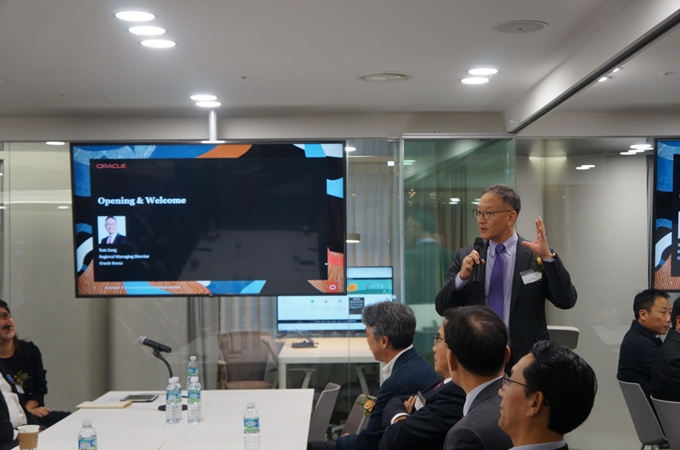 ▲탐 송 한국오라클 사장이 지티플러스에서 진행된 오라클 클라우드 혁신센터 개소식에서 환영사를 하고 있다.