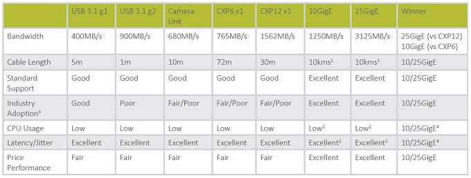 Emergent의 10GigE 및 25GigE 카메라는 Myricom의 MVA 또는 Mellanox의 VMA와 결합하여 다른 인터페이스와 성능이 같거나 혹은 더 뛰어나며, 가격적으로도 장점이 높다.
