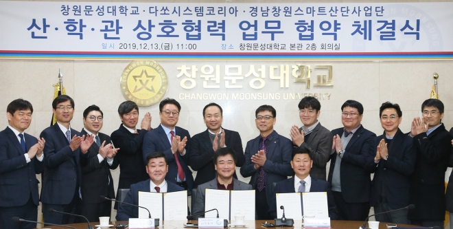 ▲(앞줄 왼쪽부터)다쏘시스템코리아 조영빈 대표이사, 창원문성대 이원석 총장, 경남창원스마트산단 박민원 단장