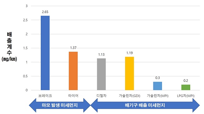 이는 DPF(매연저감장치)가 장착돼 유로6 규제를 만족하는 디젤차와 GDI(직접분사식 가솔린) 엔진이 장착된 가솔린차에서 배출되는 미세먼지보다 2배 이상 높은 수치다.