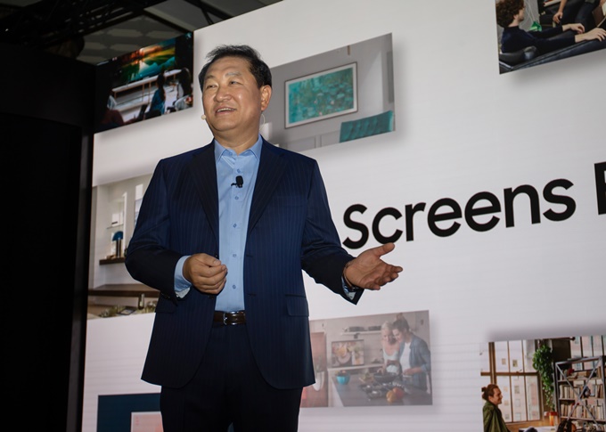 ▲ 5일(현지시간) 미국 라스베이거스에서 열린 삼성 퍼스트 룩 행사에서 삼성전자 영상디스플레이 사업부장 한종희 사장이 삼성의 ‘스크린 에브리웨어(Screens Everywhere)’ 비전을 발표하고 있다.