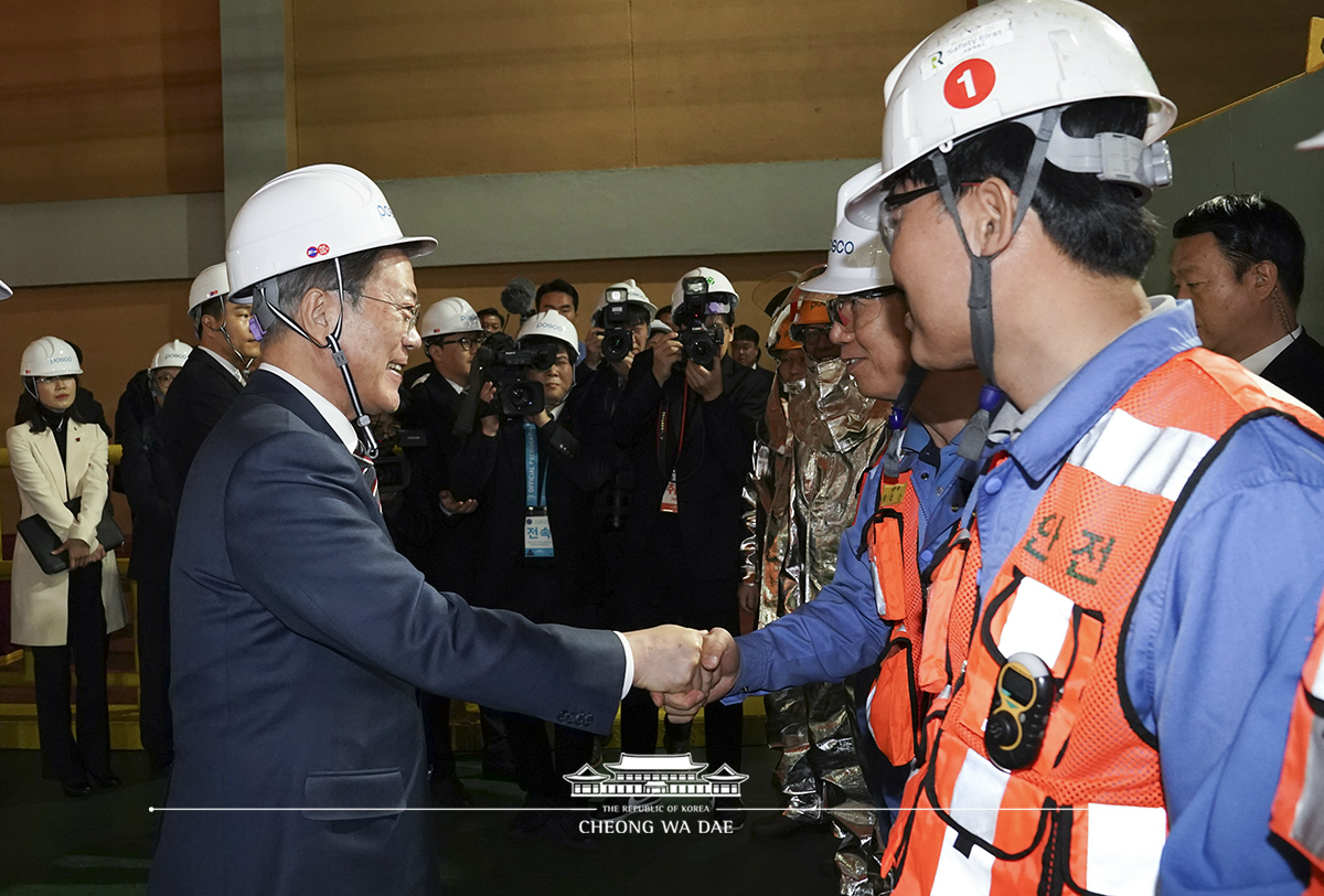 문재인 대통령이 9일 국내 유일의 ‘등대공장(Lighthouse factory)’인 포스코를 방문해 스마트 혁신 및 중소기업 상생협력 현장을 둘러보고 임직원들을 격려했다.