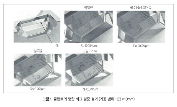 사용 공구와 절삭 조건은 표와 같다. 그림 1에 나타냈듯이 불수용성 절삭유 사용 시가 Ra 0.024µm로 면조도 값이 가장 작고, 솔류블 사용 시가 Ra 0.071µm로 면조도 값이 가장 커졌다. 수용성 절삭유(솔류블, 에멀전)의 사용 시에는 면조도 값이 커지는 경향에 있은 것을 확인할 수 있었다. 설비 상의 문제도 있지만, 요구 정도에 대응한 쿨런트를 선택하는 것이 중요하다고 할 수 있다.