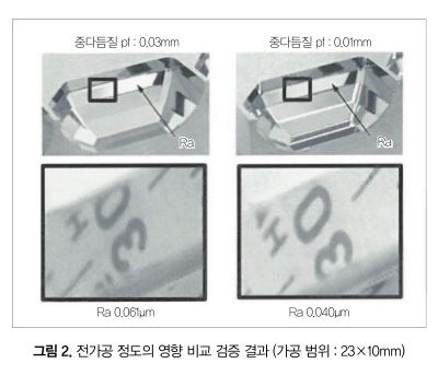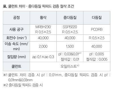 전가공 정도의 영향을 검증하기 위해 그림 1과 동일한 형상의 다면체 형상(피삭재 : STAVAX 52HRC)에서 중다듬질 시에 2개의 픽피드를 설정(pf : 0.03mm, 0.01mm), 다듬질 시에 대한 영향을 비교했다.