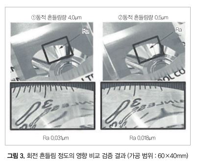 절삭 조건은 회전수 40,000min-1, 이송 속도 1,000mm/min, 픽피드 0.005mm, 절삭값 0.005mm이다. 수 µm 정도의 약간의 동적 흔들림량 차이는 있지만, ①은 가공면에 비춰 보이는 스케일의 일부에 일그러짐이 발생하고 있었다. 또한 면조도 값은 ①에서 Ra 0.031µm, ②에서 Ra 0.018µm로 되어 있다. 이 결과로부터 경면가공을 하는데 있어서는 회전 흔들림 정도의 관리가 중요하다고 할 수 있다.
