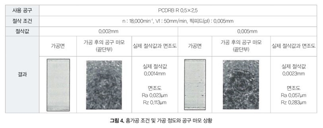 평탄부 등 공구 끝단 부근을 사용하는 형상에서 실제 절삭값을 검증하기 위해 절삭값을 0.002mm와 0.005mm의 2개로 설정, 평면가공을 했다. 결과는 그림 4에 나타냈듯이 절삭값 0.002mm 설정 쪽이 실제 절삭값은 목표값에 가까워진다는 것을 알 수 있었다.