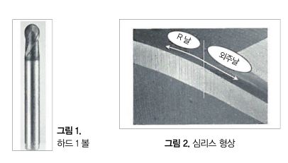 하드 1 볼은 생재에서 70HRC까지의 고경도재 거친가공에서 다듬질가공까지 폭넓게 대응하는 2날의 솔리드 볼 엔드밀이다(그림 1). 볼 절삭날의 R 정도는 ±5µm로 고정도로 하고, 또한 볼 R 절삭날과 외주 절삭날은 심리스 형상(그림 2)를 채용함으로써 양호한 다듬질면을 얻을 수 있는 동시에 가공 시의 치핑을 억제, 고정도의 가공이 가능하다.