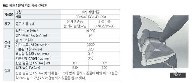 커터 보디의 팁 좌면 가공에서 하드 1 볼(ø3 : SFSB2030-S6)를 사용, 표면조도 향상을 도모한 실례를 소개한다(표 2). 피삭재는 SCM 440(38~42HRC)의 합금강이다.