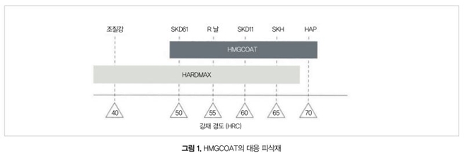 동사에는 고경도재 가공용 코팅으로서 경도, 내열성에 중점을 둔 HARDMAX가 있다. HMGCOAT는 그 HARDMAX를 베이스로 조성을 더욱 고경도 쪽으로 조정함으로써 내마모성을 향상시켰다.