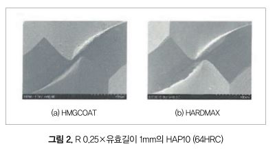 그림 2에 R 0.25×유효길이 1mm의 볼 엔드밀의 코팅 차이품인 HAP10(64HRC)의 가공 결과를 나타냈다. 절삭 조건은 회전 속도 : 39,820min-1, 이송 속도 : 670mm/min, 절입량 : ap 0.023mm, ae 0.069mm, 쿨런트에 에어블로를 사용해 4×4×깊이 0.324mm의 사각 포켓 가공을 실시했다.
