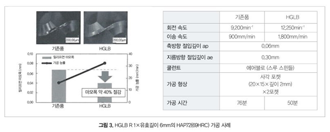 이송 속도로부터 HGLB의 절삭부하가 크다고 추측되는데, 마모폭은 기존품과 비교해 40% 억제되고 기존품보다 고능률의 가공이 가능하다는 것이 확인됐다.