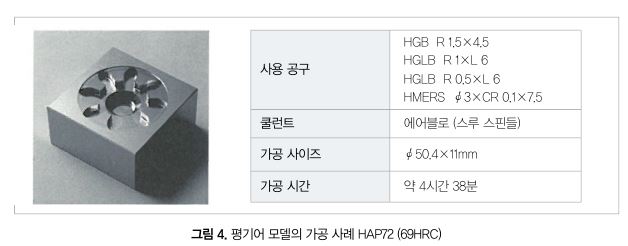 HGB/HGLB 3형번 외에, 동사의 고경도재 가공용 다날 래디우스 엔드밀 HMERS(전체 날길이 타입) 1형번, 각 1개의 합계 4개를 사용해 분말하이스재 HAP72(69HRC)로 평기어 모델 가공을 했다(그림 4).