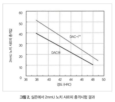 그림 2에 DAC-i의 특징인 인성을 실온의 샤르피 충격시험으로 평가한 결과를 나타냈다. 시험편은 500mm각의 강재를 유냉했을 때의 중심부에 해당하는 매우 느린 냉각 속도(베이나이트 변태 온도역의 평균 냉각 속도가 2.3℃/min)로 담금질한 것이다. 대형 금형을 생각한 담금질 조건에서 이 강종은 DAC보다 높은 인성을 나타내고 있다.