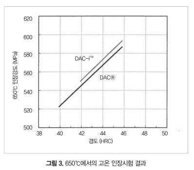 그림 3은 DAC-i의 650℃에서의 인장강도를 DAC와 비교한 결과이다. 시험편은 중량이 1t 이상인 대형 금형을 담금질했을 때에 히트크랙이 발생하는 금형 표층에서 생길 가능성이 있는 느린 냉각 속도(베이나이트 변태 온도역의 평균 냉각 속도가 5℃/min)로 다듬질한 것이다. DAC-i는 DAC보다 높은 고온강도를 나타내는 것이 확인됐다.