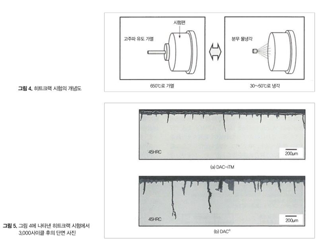 이 방법으로 45HRC 경도의 시험편에 대해 가열 온도 650℃에서 3,000사이클까지 시험을 했다. 우선 히트크랙 발생까지의 사이클 수는 DACRK 500사이클이었던 것에 대해 DAC-i에서는 1,000사이클까지 향상됐다.