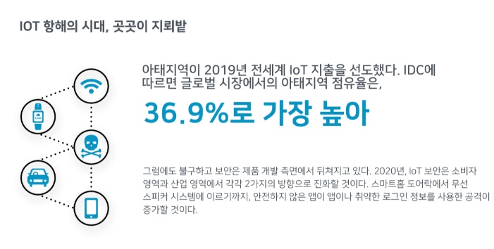 IDC에 따르면, 아태지역은 2019년 전세계 IoT 지출의 약 36.9%를 차지하며 가장 중요한 시장으로 조명받고 있다. 그럼에도 불구하고 보안은 제품 개발 측면에서 뒤쳐지고 있다. 실제로 일부 커넥티드 디바이스의 경우 소프트웨어 업데이트 및 보안 패치 수신이 불가능한 상태로 출하되고 있어, 위협에 노출되기 싶다. 2020년에는 IoT 보안에 대한 잠재적인 위협이 더욱 커질 것으로 전망된다.