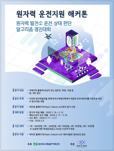 한국수력원자력(사장 정재훈)이 2월 12일까지 4차산업 관련 기술을 활용, 원자력발전소의 안전성을 높이기 위한 ‘원자력발전소 상태 판단 알고리즘 경진대회’를 개최한다.