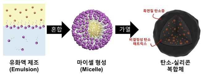 ▲탄소-실리콘 복합체 합성 과정 요약. 물, 기름, 전분, 실리콘, 계면활성제로 유화액 제조로 마이셀을 형성시킨 다음, 가열과 탄화 과정을 거치면 탄소-실리콘 복합체가 형성됨.