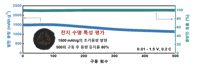 연구진이 개발한 복합소재는 기존 흑연계 음극 소재에 비해 4배 이상 높은 용량(360mAh/g → 1,530mAh/g)을 보였으며, 500회 이상 충·방전에도 안정적으로 용량이 유지되고 5분 이내에 80% 이상 급속으로 충전할 수 있는 특성을 보였다. 이러한 우수한 특성은 탄소 구조체가 실리콘의 부피팽창을 억제하여 실리콘 소재의 안정성을 높이고, 탄소의 높은 전기전도도와 실리콘 구조의 재배열을 통해 고출력 특성도 얻었기 때문이다.