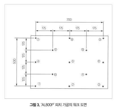 대형기에 대한 고정도 요구로서 피치 가공이 있는데, AL800P에서는 13구멍의 피치 가공(그림 3)에서 피치 정도 -1.3~0.4μm를 달성했다(표).