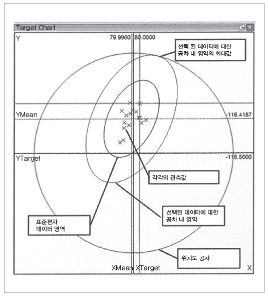 목표 차트(그림 12)는 구멍이나 핀의 위치도 분포를 나타낸다. 위치도 공차 영역에서 구멍 위치가 분포해 각과(各課)할 수 있으며 3σ의 데이터 영역 이내에 들어가 있는지, 위치도의 목표 범위에 배치되어 있는지를 확인할 수 있다.