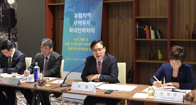 ▲ KOTRA가 26일 스페인 마드리드에서 개최한 유럽 무역·투자확대전략회의에서 코로나19 수출 부작용을 극복하고 플러스 전환 계기를 만드는 전략을 모색했다. 권평오 KOTRA 사장(오른쪽에서 두번째)이 유럽 지역 무역관장들이 참석한 회의에서 발언하고 있다.