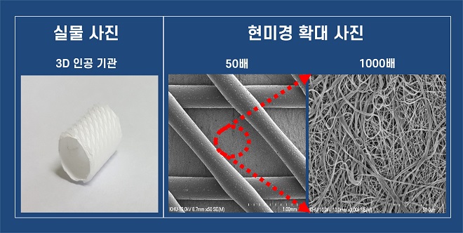 연구팀은 생체에 적합한 생분해성 소재를 이용하고 3D바이오프린팅 기술과 전기방사법(전기적 반발의 힘을 이용해 나노미터 크기의 초극세 섬유를 생산하는 기술로, 고분자 용액이 들어있는 주사기 바늘과 집진판에 고전압을 걸어 나노섬유를 만든다)을 융합해 물리적 강도가 우수하면서 기관조직 재생에 도움이 되는 약물을 안정적으로 전달할 수 있는 3D 튜브형 인공 기관을 만들었다.