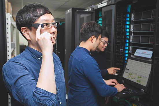 ▲SK텔레콤 연구원이 MEC플랫폼이 설치된 서버실에서 AR글래스를 쓰고, 산업용 AR서비스를 시험해보고 있다.