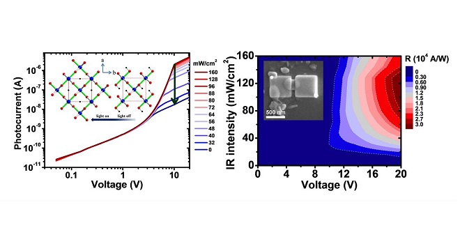 (왼쪽) 광의 강도에 따라 변화하는 전압에 따라 변화하는 광 전류 그래프와 광이 조사되었을 때와 제거되었을 때의 HVO2 결정의 구조. (오른쪽) 광의 강도와 전압의 변화에 따른 센서의 반응성 변화를 보이는 등고선과 소자 이미지