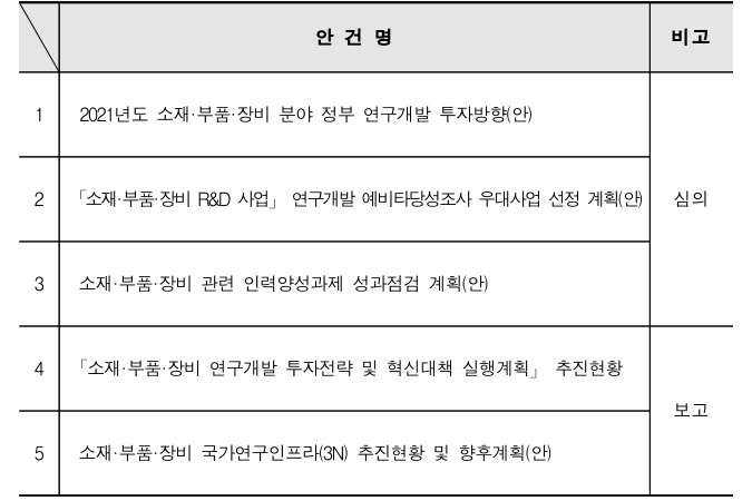 한편, 이번 회의에는 '소재·부품·장비 연구개발 투자전략 및 혁신대책 실행계획 추진현황'과 '소재·부품·장비 국가연구인프라(3N) 추진현황 및 향후계획(안)'도 보고 되었다.
