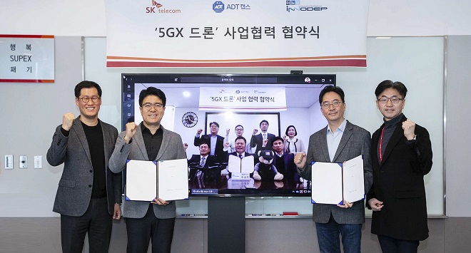 SK텔레콤이 국내 대표 보안기업인 ADT캡스, 지능형 영상분석 플랫폼 기업인 이노뎁과 함께 ‘5GX 드론 솔루션의 개발 및 사업화’를 위한 3사 협약을 체결했다.