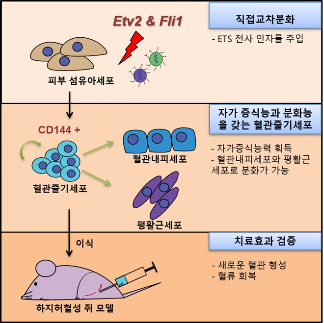 이 문제를 해결하기 위해 김정범 교수팀은 ‘만능 분화 단계’를 건너뛰고 특정 세포를 원하는 세포로 바로 바꾸는 ‘직접교차분화’ 기법을 이용해 혈관줄기세포를 만들었다. 피부를 구성하는 섬유아세포에 두 가지 유전자(Etv2, Flil)를 주입해 혈관줄기세포로 탈바꿈한 것이다.