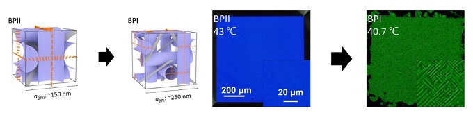 ▲블루페이즈 두 상인 BPII(왼쪽)와 BPI(오른쪽)의 결정구조 모식도. 온도를 조절하면 파란색 BPII에서 초록색 BPI으로 순간적으로 변화시킬 수 있다. 하지만 광학 현미경으로는 상전이 과정 중 내부결정구조의 변화를 알아낼 수 없으며, 특히 상전이 과정에서 관찰되는 초록색 BPI의 격자무늬가 생기는 이유는 미스테리로 남아있었다.