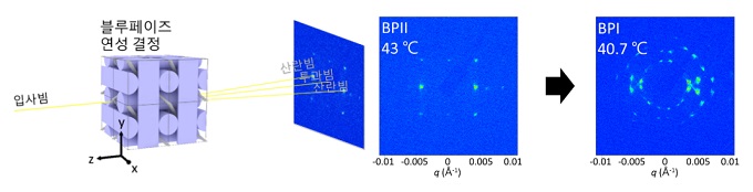 ▲공명연 엑스선 산란을 이용한 블루페이즈 연성격자 관찰 모식도(왼쪽) 및 이를 이용해 관찰한 블루페이즈 상전이 중의 산란 패턴(오른쪽). 관찰한 산란 패턴을 이용하면 상전이 중의 내부결정구조의 변화를 재구성할 수 있다.