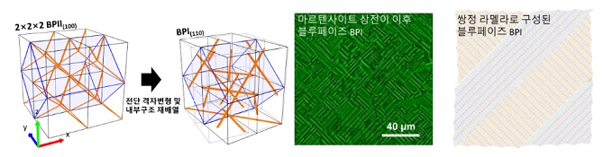 상전이 이후 블루페이즈 액정에서 관찰되는 격자무늬는 지금까지 그 발생 원인이 미스테리로 남아있었으나, 이는 마르텐사이트 상전이에서 발생하는 ‘쌍정(twin)’인 층상 구조(lamella structure)와 같다는 것을 이번 연구를 통해 밝혀냈다.