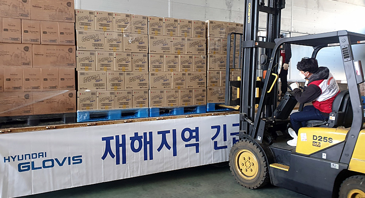 현대글로비스는 지난 2월부터 전국재해구호협회가 준비한 긴급 구호품을 전국 각지에 무상 운송하고 있다.