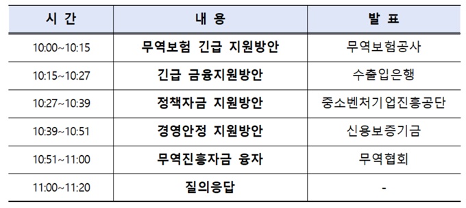 기관별로 무역진흥자금 융자(무역협회), 무역보험 긴급 지원방안(무보), 긴급 금융지원방안(수은), 정책자금 지원방안(중진공), 경영안정 지원방안(신보) 등 코로나19 피해 기업을 위한 주요 금융상품과 자금 활용 팁을 소개할 예정이다. 발표 후에는 기업들로부터 접수한 사전 질의 및 생중계 중 질의에 대해 답변하는 시간도 마련됐다.