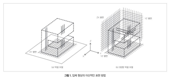 이 형상 정도의 불균일성을 개선하기 위해 X방향이나 Y방향의 선분군도 이용해 입체 형상을 표현하는 3방향 덱셀(3방향 레이나 Boundary map이라고 불리는 것도 있다) 모델링도 보급의 조짐이 보이기 시작하고 있다(그림 1).