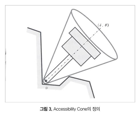 이와 같은 원뿔형을 Accessibility Cone(접근 가능성 원뿔, AC)이라고 부른다(그림 3). 안전하게 절삭가공을 하기 위해서는 AC의 꼭지각이 충분히 클 필요가 있다.